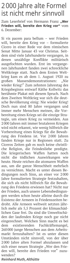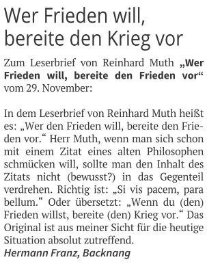 Meine Antwort zum Leserbrief von Hermann Franz „Wer Frieden will, bereite den Krieg vor“ vom 6. Dezember: